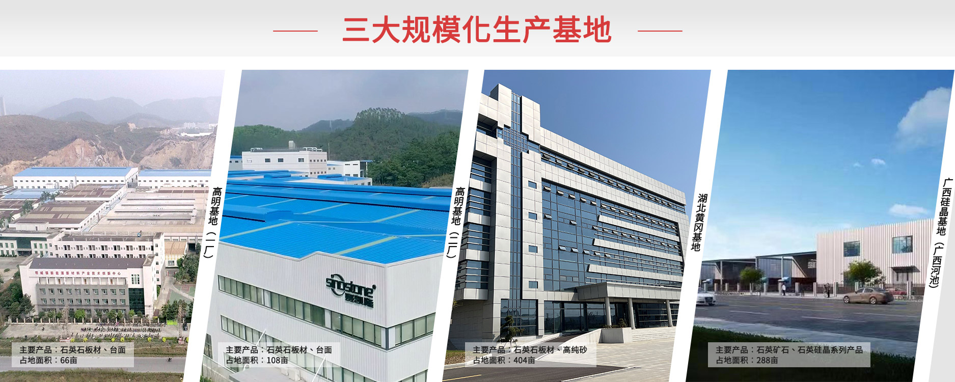 在湖北省黄冈市投资建设高智能化人造石英石生产制造基地,占地面积约400亩,秉承环保与质量并行的理念,实现高效优质生产的完美跃进。